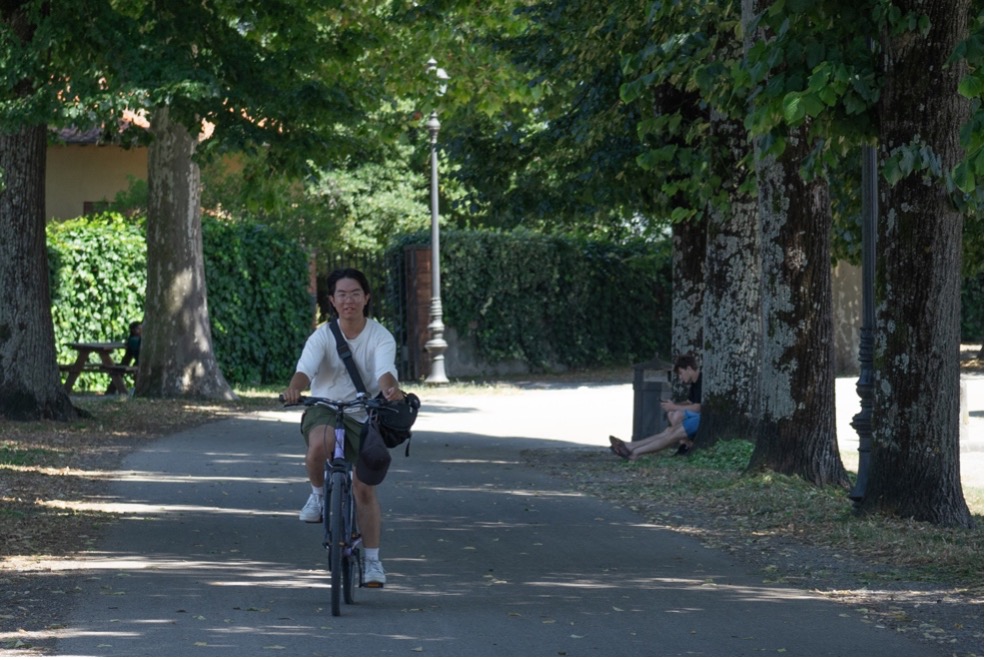 而在盧卡,則感受到這座被城牆環繞的城市的獨特魅力,同學們從城牆上騎自行車繞了一圈,約花了 45 分鐘,沿途不僅欣賞到城市全景,也發現許多原本作為防禦設施的牆體,如今已轉化為居民的公共空間,展現了歷史遺構再利用價值。